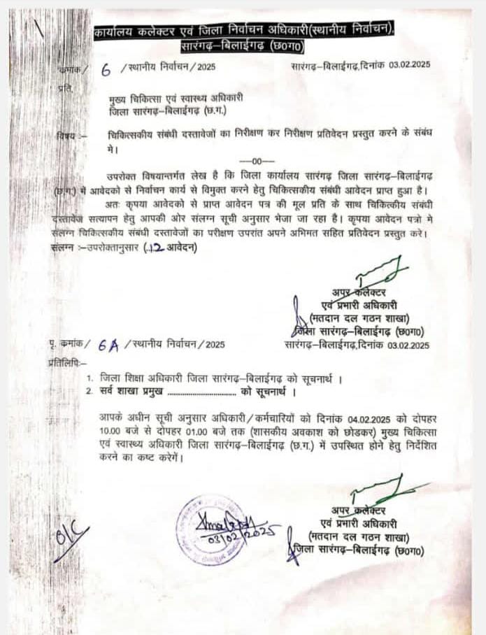 सारंगढ़ बिलाईगढ़, 5 फरवरी 2025/कलेक्टर एवं जिला निर्वाचन अधिकारी धर्मेश कुमार साहू के निर्देश पर जिले के मतदान दल गठन शाखा की ओर से 1 फरवरी से प्रतिदिन प्राप्त आवेदनों का मेडिकल जांच किया जा रहा है। यह आवेदन सरकारी कर्मी निर्वाचन ड्यूटी से बचने या अपनी असमर्थता के कारण दिया जा रहा है। इन आवेदनों को जिला प्रशासन की ओर से सीएमएचओ जिला सारंगढ़ बिलाईगढ़ को भेजा जा रहा है। इन आवेदनों पर मेडिकल परीक्षण उपरांत दिए गए अभिमत पर कलेक्टर एवं जिला निर्वाचन अधिकारी निर्णय लेंगे। आवेदन देने वाले सरकारी कर्मी को प्राप्त आवेदन के दूसरे दिन (शासकीय अवकाश को छोड़कर) मेडिकल जांच के लिए भेजा जा रहा।
