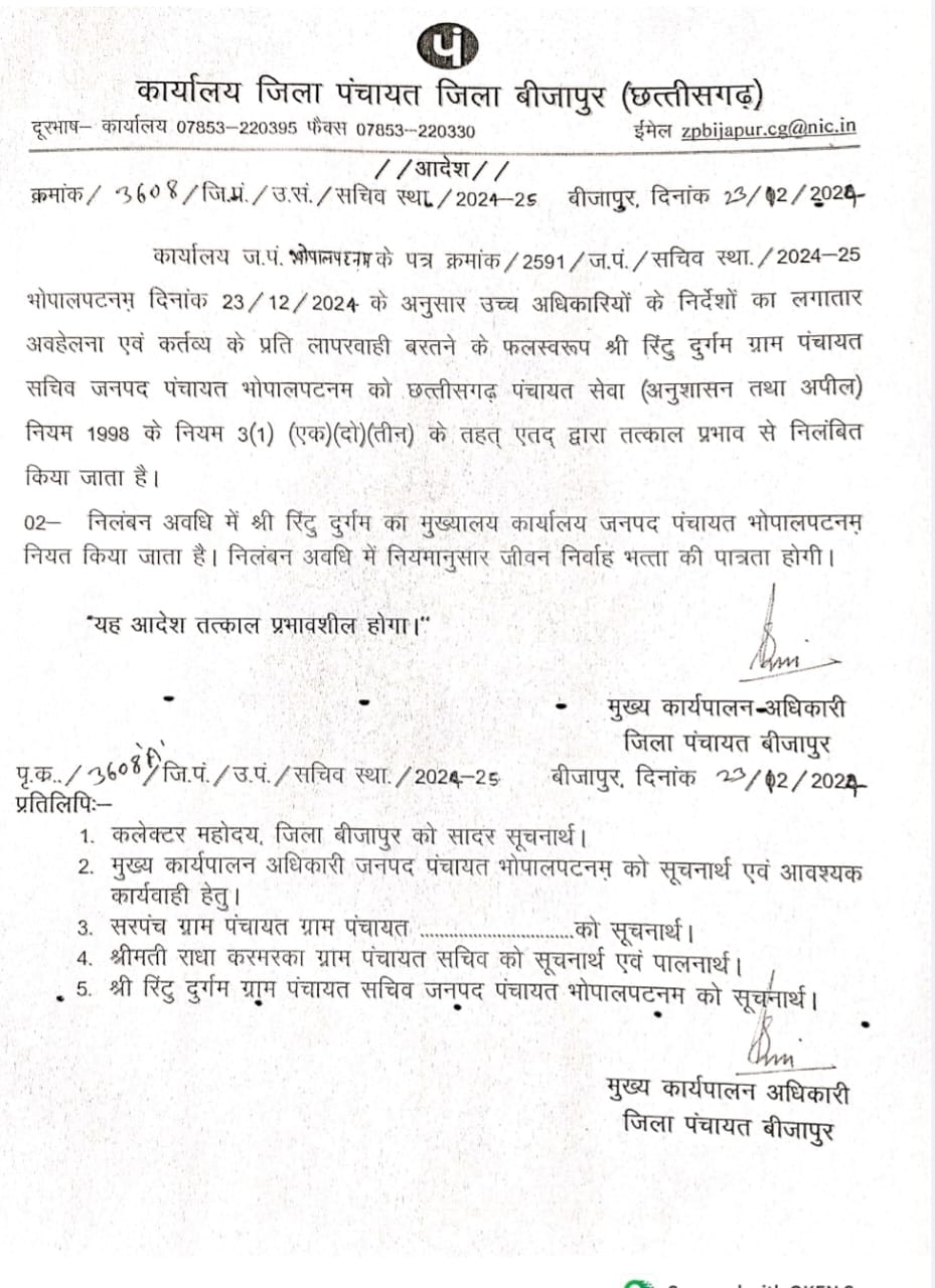 बीजापुर 25/12/24- जिला पंचायत मुख्य कार्यपालन अधिकारी श्री हेमंत रमेश नंदनवार द्वारा जनपद पंचायत भोपालपटनम के सचिव श्री रिंटु दुर्गम को कर्तव्य में लापरवाही एवं अनुशासनहीनता के कारण तत्काल प्रभाव से निलंबित किया गया है। छत्तीसगढ़ पंचायत सेवा अनुशासन तथा अपील नियम 1998 के नियम 3(1) (एक)(दो)(तीन) के तहत् निलंबित करते हुए श्री दुर्गम का मुख्यालय कार्यालय जनपद पंचायत भोपालपटनम नियत किया गया है।