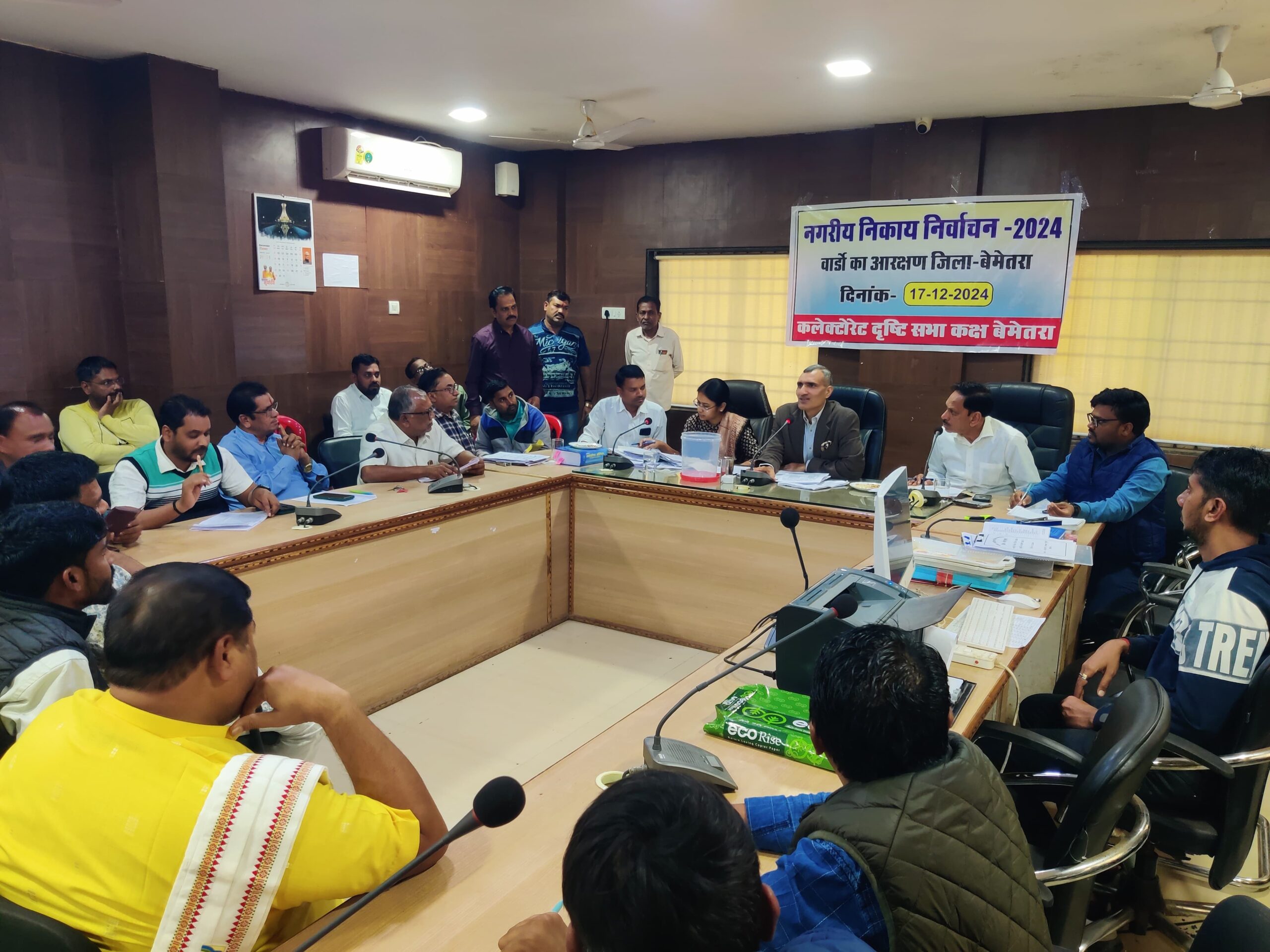 बेमेतरा, 19 दिसंबर 2024/-छत्तीसगढ़ शासन नगरीय प्रशासन एवं विकास विभाग मंत्रालय के परिपालन मे 17 दिसम्बर 2024 को कार्यालय कलेक्टोरेट दृष्टि सभा कक्ष में कलेक्टर श्री रणबीर शर्मा कि उपस्थिति मे नगरीय निकाय निर्वाचन 2024 जिला बेमेतरा वार्डो का आरक्षण छत्तीसगढ़ नगर पालिका (अ.जा./अ.ज.जा/अन्य पिछड़ा वर्ग एवं महिलाओं के लिए वार्डो का आरक्षण ) नियम 1994 तथा छत्तीसगढ़ नगर पालिका अधिनयम 1961 की धारा 29( क) में दिए गए प्रावधानों के अधीन आरक्षण की कार्यवाही की गई। जिसमें जिले के नगर पंचायत मारो को छोड़कर शेष सभी निकायों का आरक्षण जनप्रतिनिधि/गणमान्य नागरिकों/पत्रकारों/निकाय के अधिकारी कर्मचारी की उपस्थिति में कार्यवाही की गई ।