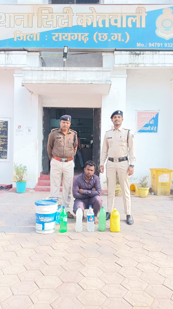 आरोपी की पहचान आकाश उरांव (32), पिता बरतराम उरांव, निवासी मधुबनपारा दुर्गा मंदिर के पीछे, रायगढ़ के रूप में हुई। पुलिस ने उसके खिलाफ धारा 34(2) और 59(क) आबकारी अधिनियम के तहत मामला दर्ज कर लिया है।