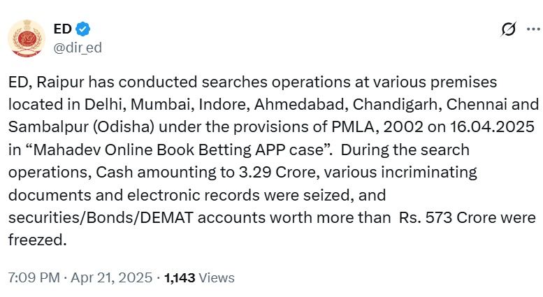 रायपुर। देश को झकझोर देने वाले महादेव ऑनलाइन बुक बेटिंग ऐप घोटाले में प्रवर्तन निदेशालय (ED) ने 16 अप्रैल 2025 को अब तक की सबसे व्यापक और निर्णायक कार्रवाई की है। धन शोधन निवारण अधिनियम (PMLA), 2002 के प्रावधानों के अंतर्गत दिल्ली, मुंबई, इंदौर, अहमदाबाद, चंडीगढ़, चेन्नई और ओडिशा के संबलपुर सहित विभिन्न शहरों में एक साथ सघन छापेमारी अभियान चलाया गया।