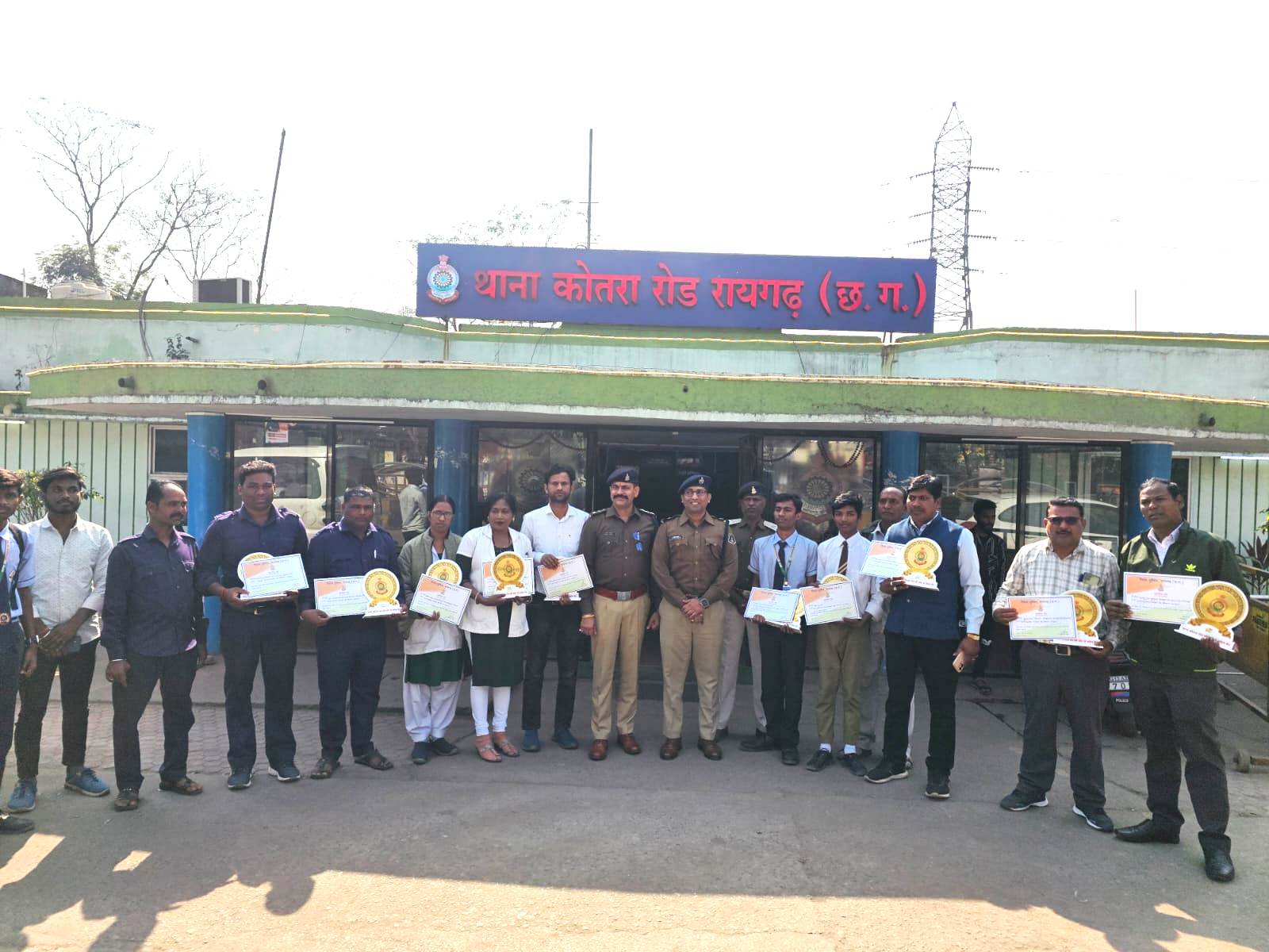 इस अवसर पर अतिरिक्त पुलिस अधीक्षक श्री आकाश मरकाम और थाना प्रभारी कोतरारोड़ श्री त्रिनाथ त्रिपाठी की उपस्थिति में थानाक्षेत्र के 10 उत्कृष्ट व्यक्तियों को प्रशस्ति पत्र और मोमेंटो देकर सम्मानित किया। इनमें शिक्षकों, स्वास्थ्य कर्मियों, ग्राम कोटवारों और छात्रों को उनके विशिष्ट योगदान के लिए सराहा गया।