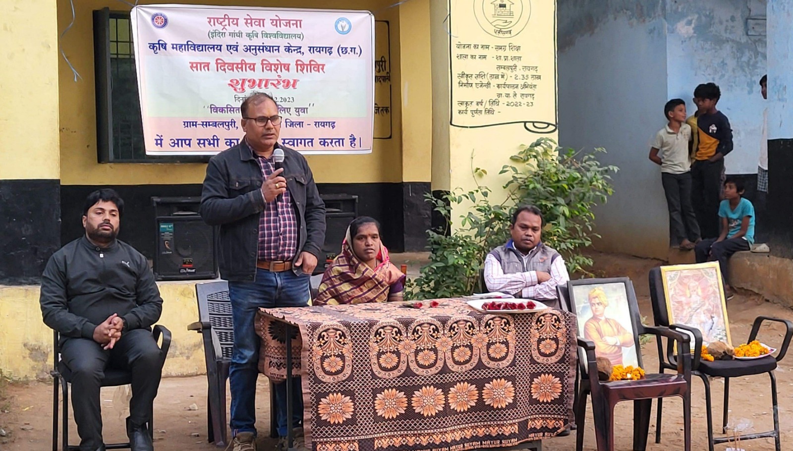 रायगढ़, 26 दिसम्बर2023/ राष्ट्रीय सेवा योजना इकाई कृषि महाविद्यालय एवं अनुसंधान केंद्र रायगढ़ द्वारा संबलपुरी गांव में 23 से 29 दिसम्बर तक चलने वाले सात दिवसीय विशेष शिविर का शुभारंभ किया गया। जिसका थीम था विकसित भारत के लिए युवा। सात दिवसीय शिविर के लिए महाविद्यालय द्वारा जिले में स्थित प्राथमिक शाला भवन संबलपुरी ग्राम पंचायत का चुनाव किया गया। शिविर के पहले दिन मुख्य अतिथि के रूप में उपस्थित ग्राम पंचायत संबलपुरी सहोद्रा राठिया ने स्वामी विवेकानंद के चित्र के समक्ष दीप प्रज्वलित करके किया। श्रीमती सहोद्रा राठिया ने सभी स्वयंसेवकों को संबोधित करते हुए कहा की विकसित राष्ट्र बनाने के लिए आप जैसे युवाओं का हर तरीके से प्रतिबद्ध रहना बहुत ज़रूरी है। उन्होंने कहा कि सात दिन तक आप सब लोग मिलकर गाँव में किसानों और विद्यालय में पढ़ रहे बच्चों हर प्रकार से जागरूक करेंगे। शिविर के पहले दिन सभी राष्ट्रीय स्वयं सेवकों को कार्यक्रम अधिकारी श्री गंगा राम राठिया द्वारा राष्ट्रीय सेवा के लिए शपथ दिलाया गया और सात दिन खूब मेहनत करके अपना श्रमदान करने के लिए प्रेरित किया।
