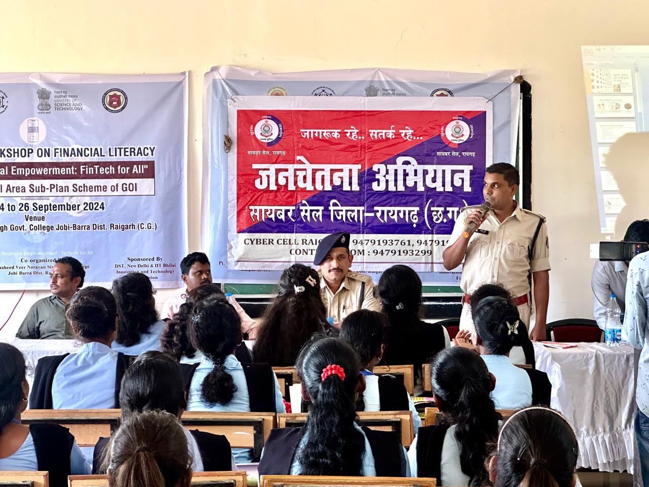 इसी कड़ी में आज थाना खरसिया क्षेत्र के *शहीद वीरनारायण शासकीय महाविद्यालय जोबी बर्रा* में साइबर जागरूकता कार्यक्रम आयोजित किया गया। इस कार्यक्रम में डीएसपी श्री अभिनव उपाध्याय, पुलिस चौकी जोबी प्रभारी एएसआई श्री आशिक रात्रे, साइबर सेल के हेड कांस्टेबल श्री दुर्गेश सिंह, कांस्टेबल नवीन शुक्ला ने महाविद्यालय के प्राचार्य, शिक्षकगण और छात्र-छात्राओं की उपस्थिति में साइबर सुरक्षा के प्रति जागरूकता बढ़ाने के उद्देश्य से महत्वपूर्ण जानकारी प्रदान की।