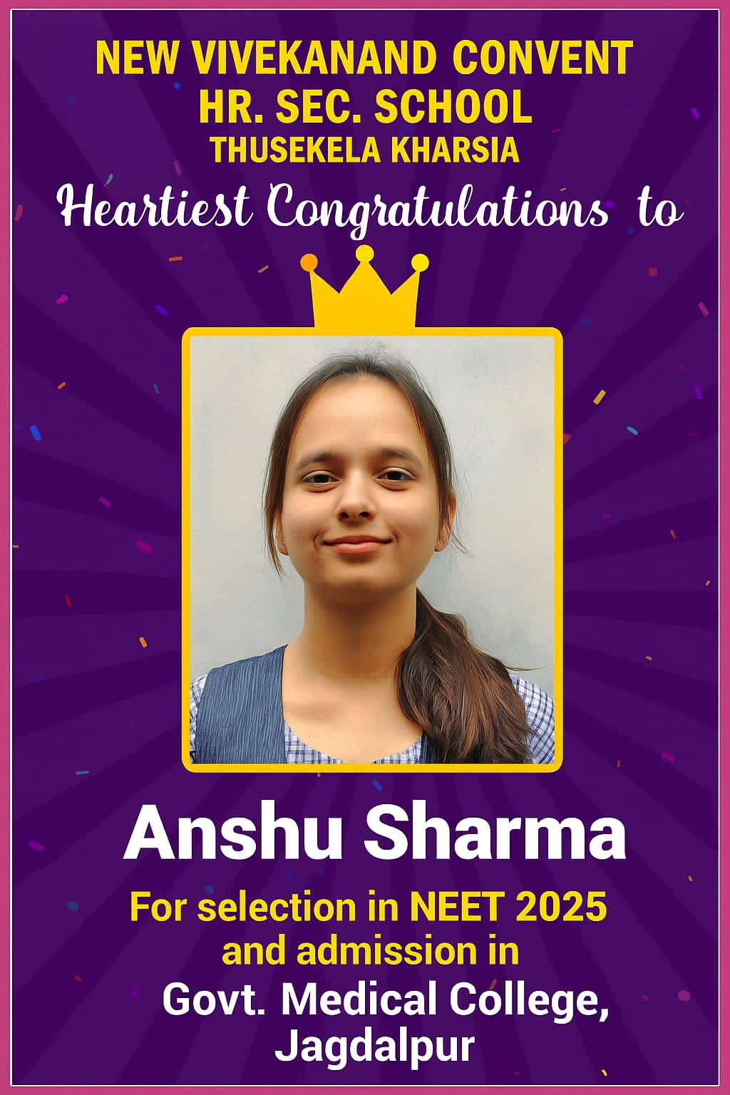 NEET परीक्षा में सफलता के बाद अंशु शर्मा का चयन शासकीय चिकित्सा महाविद्यालय, जगदलपुर (छत्तीसगढ़) में हो चुका है। इस उपलब्धि से न केवल उनके माता-पिता गर्वित हैं, बल्कि पूरा विद्यालय परिवार भी गौरवान्वित है।