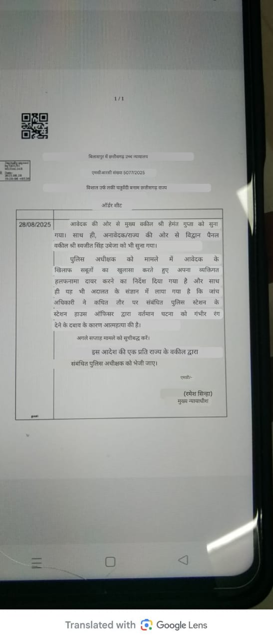 ऐसे में हम सभी छत्तीसगढ़ वासियों को जरा गंभीरता सें विचार करने की आवश्यकता है, कि क्या हम अपनी भाखा, बोली और संस्कृति के अलावा बतौर अपराधिक गतिविधियों के लिये भी अब पहचाने जा रहे है? और क्या यह तमगा छत्तीसगढ़ जैसे चोरबोरात ले पसीना बहाऊ अऊ मेहनत के रोटी खाके लाद देके सूतो वाली सोंच और विचारधारा के बलबूते पुरे दुनिया में मजबुती के साख बनाने वाली सूबे लिये सही है। यदि सही नही है तो हम राज्य में तेज गति के साथ दिनोदिन बढ रही अपराधिक गतिविधियों की रोकथाम के लिये क्या उचित कदम उठा रहे है? चूंकि सूबे में कानून व्यवस्था का भंयकर बुरा हाल है। जिसका आलम सूबे के गृहमंत्री के गृहजिले में पदस्थ कलेक्टर ने एसपी से अपनी सुरक्षा हेतू गुहार लगा कर बंया कर दिया है। वंही दूसरी तरफ एक पुलिस अधिकारी जो आम जनता को सुरक्षा प्रदान करता है वह स्वंय थाना के बैराक में फांसी लगाकर आत्महत्या कर लेता है। अब ऐसे में चुप्पी साधकर बैठे रहना शायद किसी भी छत्तीसगढ़ वासियो के लिये बर्दास्त योग्य नही माना जा सकता है। बहरहाल लंबी चुप्पी और बालोद पुलिस की जबरदस्त सुस्ती के बीच दल्लीराजहरा थाना में पदस्थ रहे ASI हिरामन मंडावी आत्महत्या प्रकरण और इस प्रकरण को लेकर बेबाकी के साथ आवाज बुंलद करने वाले मिराज खान के विषय में माननिय हाईकोर्ट बिलासपुर ने बालोद पुलिस से गंभीरता के साथ हलफनामा और जवाब लबत किया है। माननिय हाईकोर्ट बिलासपुर के द्वारा जारी आदेश को देखकर ASI हिरामन मंडावी से तात्लुक रखने वाले लोग हैरान हो चुके है।