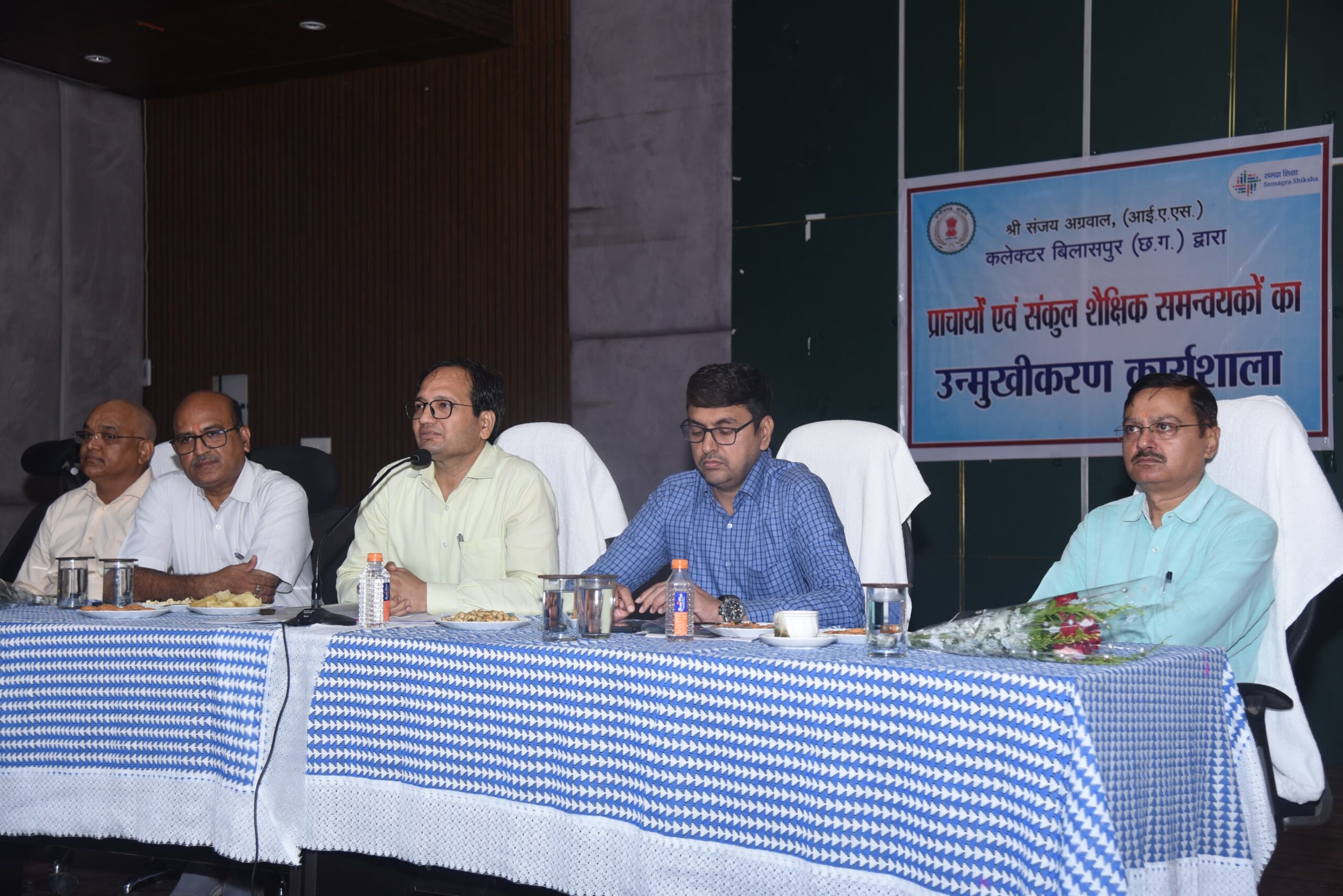 बिलासपुर :- 25 जुलाई 2025/कलेक्टर संजय अग्रवाल की अध्यक्षता में आज जिले के समस्त संकुल शैक्षिक समन्वयकों एवं प्राचार्यों की संयुक्त बैठक स्थानीय देवकीनन्दन दीक्षित सभा भवन, लाल बहादुर शास्त्री स्कूल परिसर में आयोजित की गई। बैठक का मुख्य उद्देश्य विद्यालयों में शिक्षा की गुणवत्ता में सुधार लाना और छात्रों के शैक्षणिक प्रर्दशन को बेहतर बनाना था। कलेक्टर ने सभी प्राचार्याें को निर्देश दिए कि वे विद्यालय मे नियमित कक्षाओं का संचालन सुनिश्चित करें। शिक्षकों की उपस्थिति पर विशेष निगरानी रखें और कमजोर छात्रों पर ज्यादा ध्यान देते हुए उनके लिए विशेष कक्षाएं आयोजित करें। उन्होंने कहा कि शिक्षा केवल पाठ्यक्रम तक सीमित नहीं होना चाहिए बल्कि छात्रों में नैतिक मूल्यों और व्यावहारिक ज्ञान का भी विकास होना चाहिए। बैठक में नगर निगम कमिश्नर अमित कुमार, सीईओ जिला पंचायत संदीप अग्रवाल, जिला मिशन समन्वयक ओम पाण्डेय, सहायक परियोजना अधिकारी रामेश्वर जायसवाल सहित जिला शिक्षा कार्यालय के समस्त अधिकारी एवं कर्मचारी उपस्थित रहे।