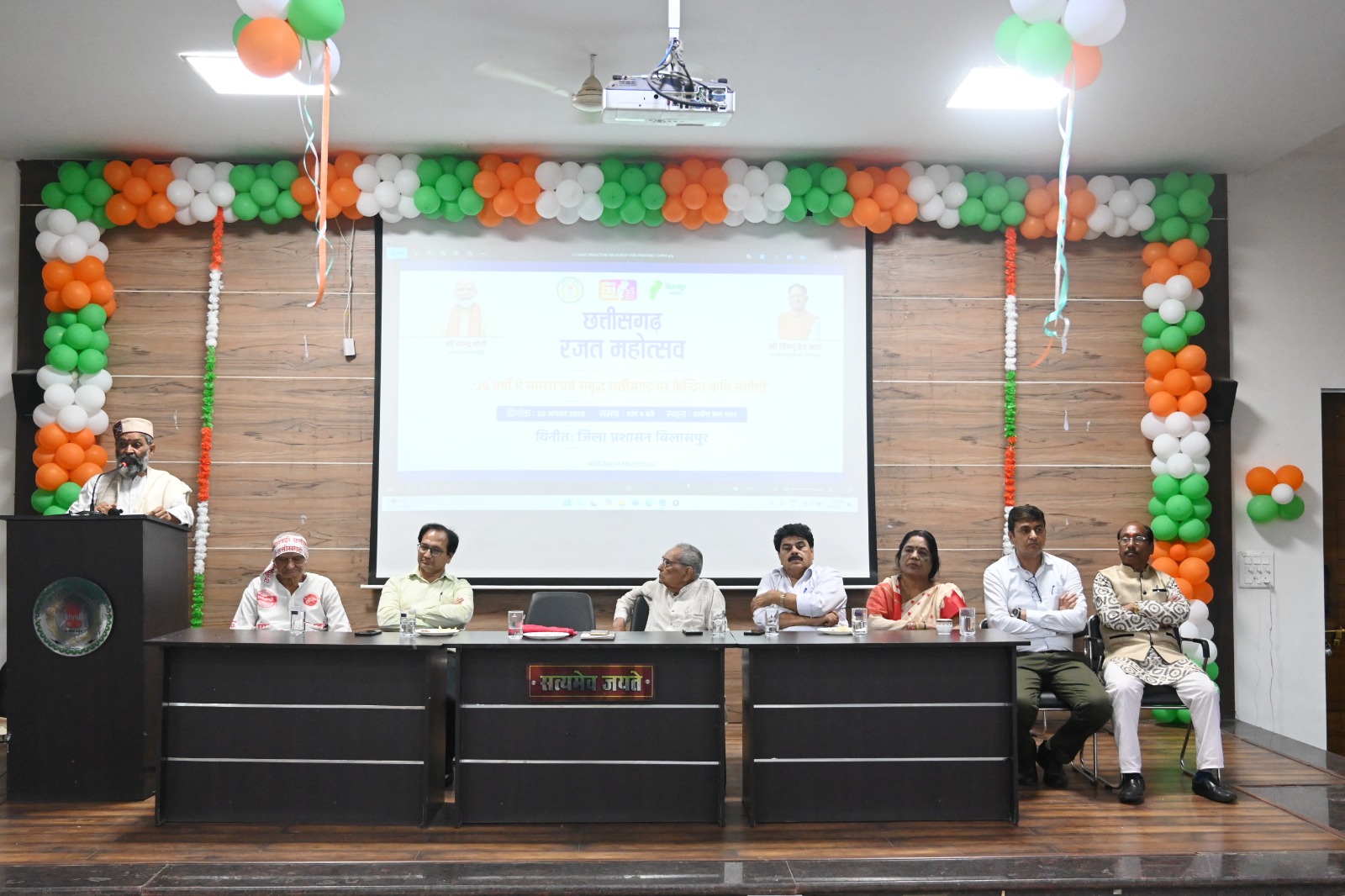 बिलासपुर :- 21 अगस्त 2025/छत्तीसगढ़ रजत महोत्सव के अंतर्गत जिला प्रशासन द्वारा प्रार्थना सभा भवन में कवि गोष्ठी का आयोजन किया गया। राज्य निर्माण के इन पच्चीस वर्षों में छत्तीसगढ़ में हुए विकास एवं समरस संस्कृति को कवियों ने गीतों में पिरोकर अपनी सुन्दर प्रस्तुतियों से खूब वाहवाही लूटी। राज्य के जन्म से लेकर युवा होने तक की गाथा सुनकर दर्शक भाव-विभोर हो गए। रजत जयंती पर 25 से ज्यादा नामी गिरामी कवियों ने अपनी शानदार प्रस्तुति से सबका मन मोह लिया। अटल बिहारी वाजपेयी विश्वविद्यालय के कुलपति डॉ0 एडीएन वाजपेयी ने छत्तीसगढ़ महतारी की पूजा-अर्चना कर संगोष्ठी का शुभारंभ किया। समारोह की अध्यक्षता वरिष्ठ साहित्यकार सतीश जायसवाल ने की। विशिष्ट अतिथि के रूप में इस अवसर पर वरिष्ठ पत्रकार, कवि एवं साहित्यकार नन्द किशोर शुक्ल, राजेश चौहान, डॉ. अजय पाठक एवं रश्मिलता मिश्रा उपस्थित थीं।