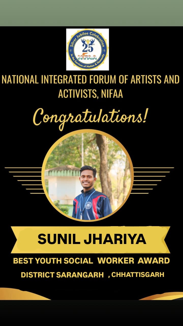 सारंगढ़ जिले से चयनित प्रतिभागी सुनील झरिया का चयन उनके सामाजिक क्षेत्र में किए गए उल्लेखनीय कार्य 100 वृक्षारोपण,13 रक्तदान शिविर एवं राष्ट्रीय सेवा योजना में किये गये सभी कार्यों के आधार पर किया गया है। प्रतिभागियों को “यंग सोशल चेंजमेकर अवार्ड”, “वर्ल्ड रिकॉर्ड ऑफ एक्सीलेंस (इंग्लैंड) सर्टिफिकेट”, टी-शर्ट और मोमेंटो से सम्मानित किया जाएगा।