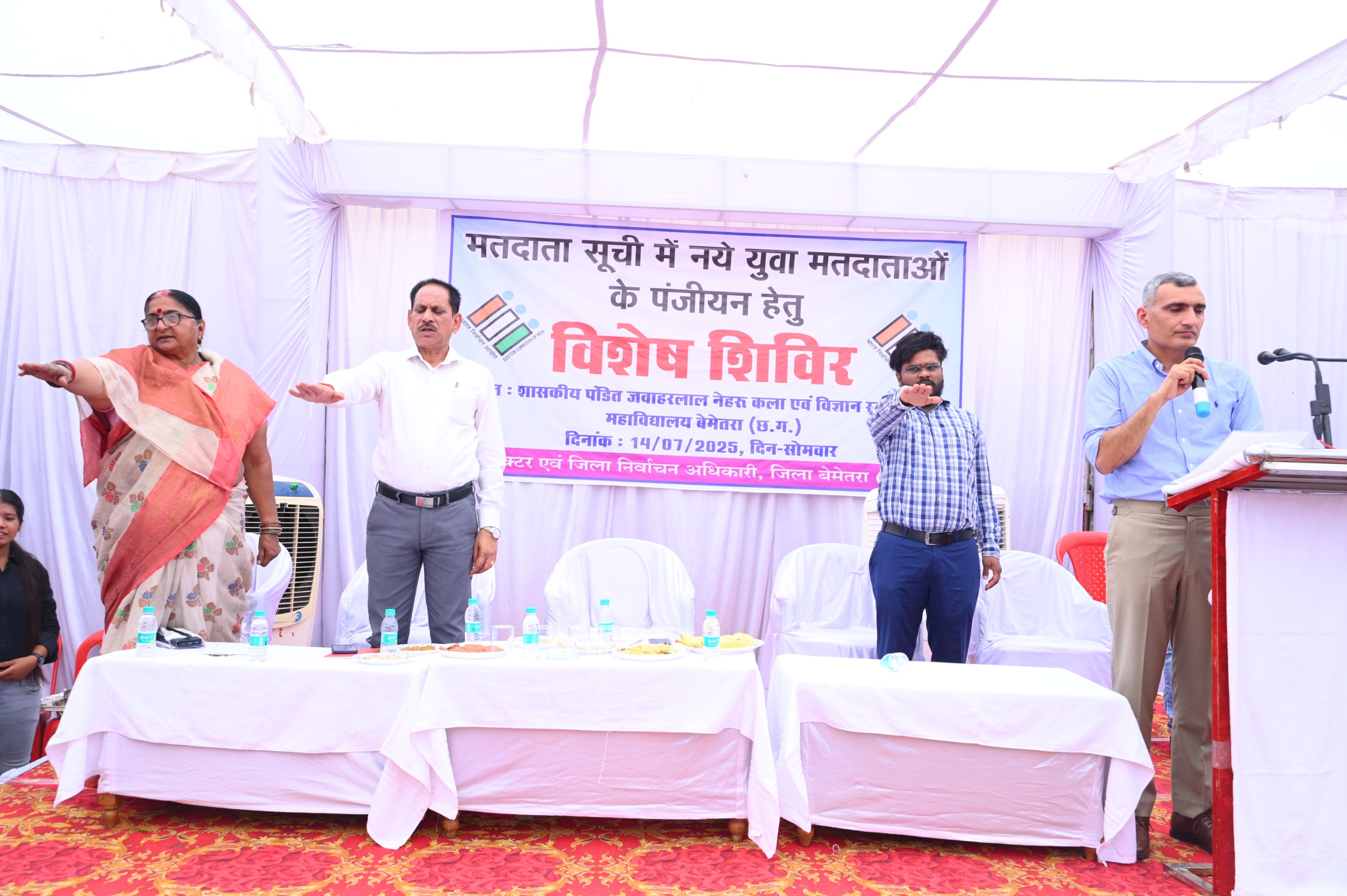बेमेतरा :- 14 जुलाई 2025:- शासकीय पं. जवाहरलाल नेहरू कला एवं विज्ञान स्नातकोत्तर महाविद्यालय बेमेतरा में 18 से 19 वर्ष की आयु वर्ग के नवयुवाओं के लिए मतदाता सूची में नाम दर्ज कराने हेतु विशेष पंजीयन शिविर का आयोजन किया गया। इस अवसर पर कलेक्टर एवं जिला निर्वाचन अधिकारी रणबीर शर्मा विशेष रूप से उपस्थित रहे। उन्होंने विद्यार्थियों को लोकतंत्र की मजबूती में युवाओं की भागीदारी का महत्व समझाते हुए प्रेरणास्पद संबोधन दिया।